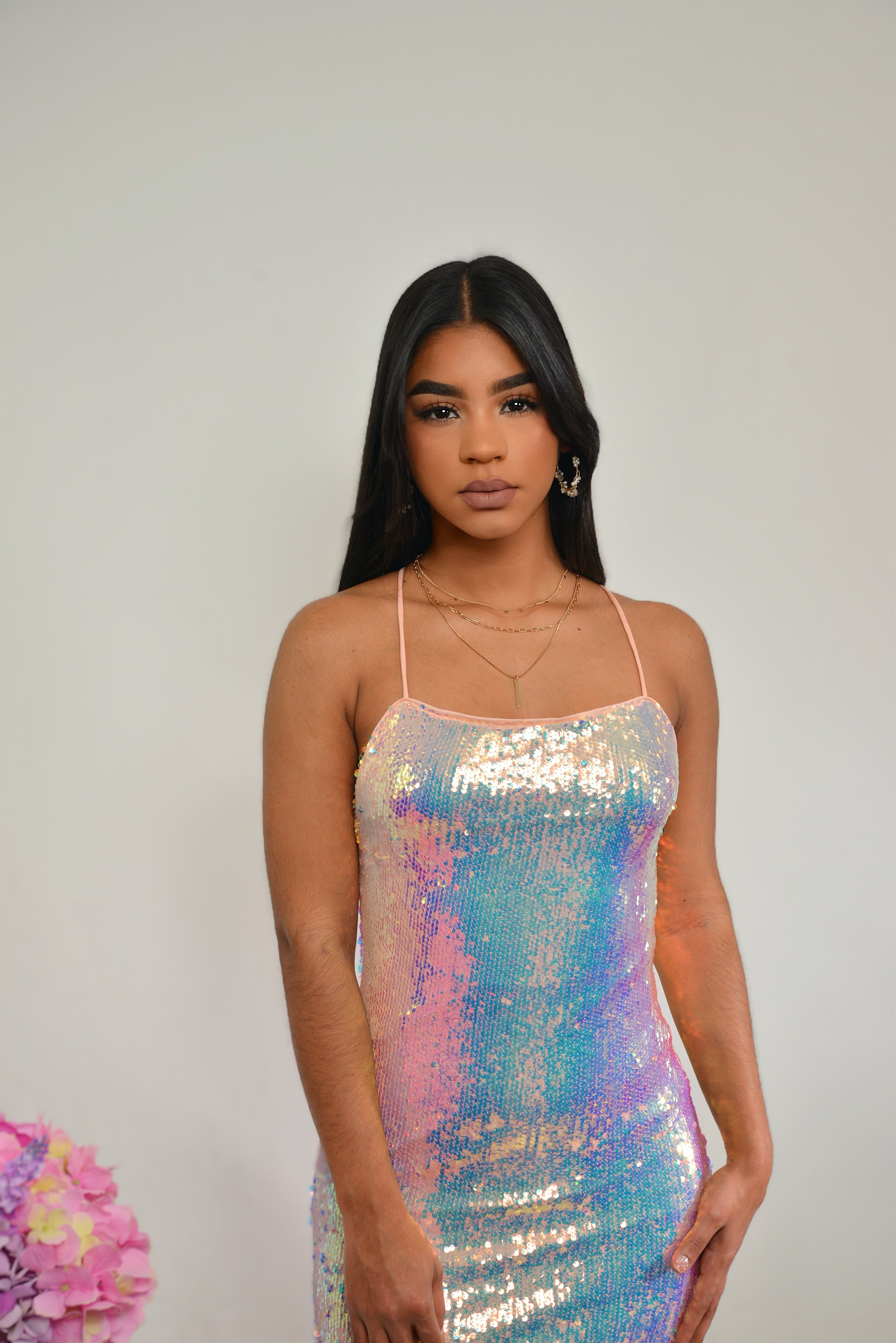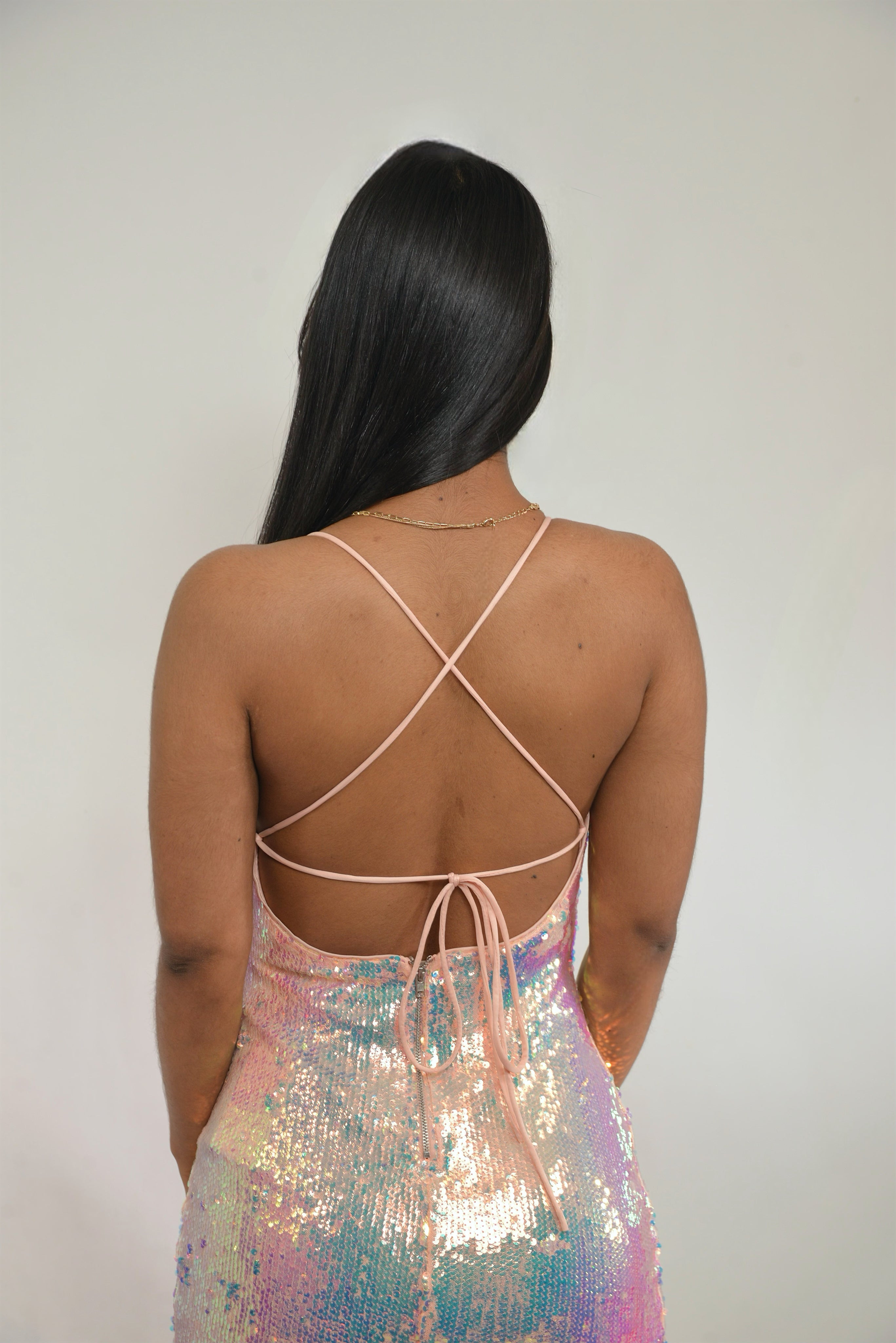 Vestido de lentejuelas, color rosa,tirantes a la espalda.